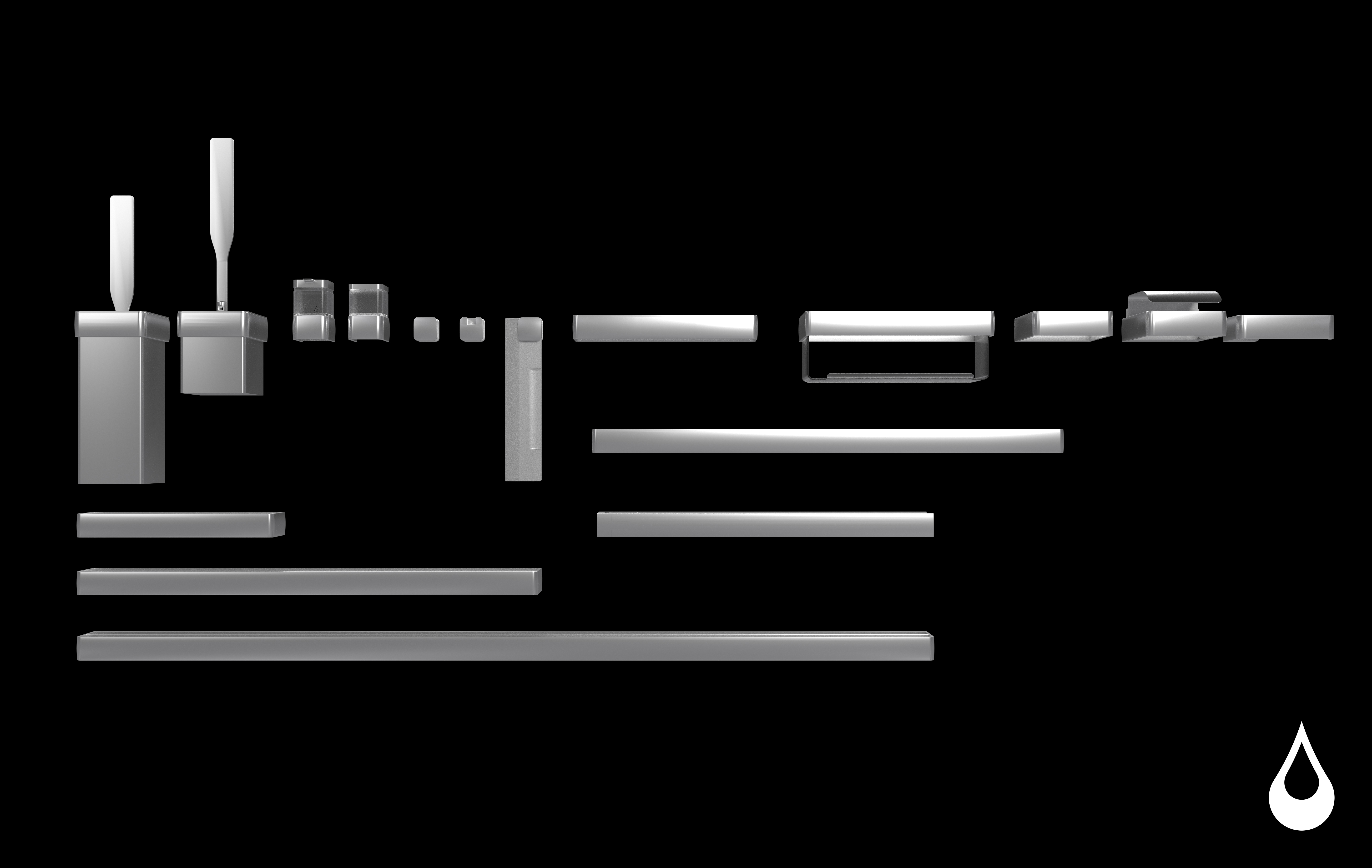 Most of the items consist of the same aluminum extrusion profile. This limits the amount of tooling required, plus it gives the series a unified look.