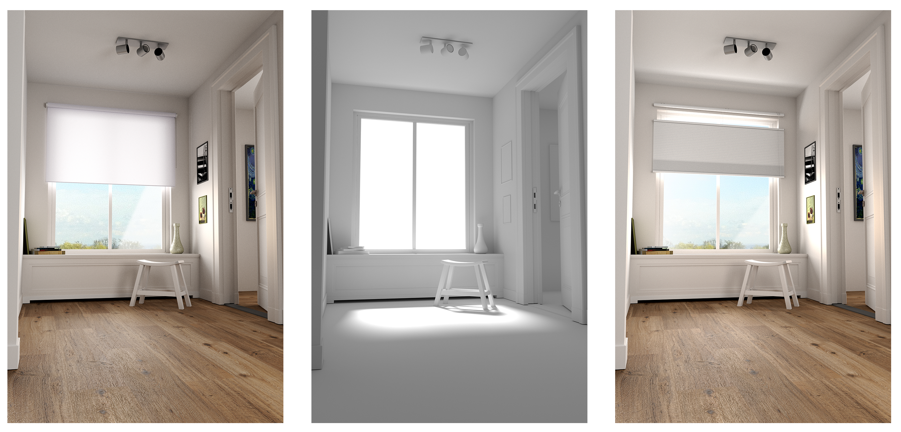 Window decoration scene 3D Graphics Left: Roller blind; Center: Clay render; Right: Pleated blind High polygon render of a scene for the Window decoration department of the Fetim group.